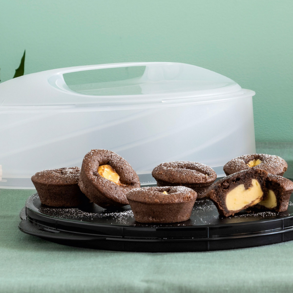 Van de platte fruitcake tot de meerlagige cake uit het Zwarte Woud, ze passen allemaal in deze cakecontainer. Het deksel is laag en hoog te verstellen.