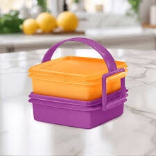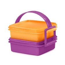 Deze Click & Go set bestaat uit twee vierkante broodtrommels in vrolijke kleuren – één oranje en één paars – en een paars draaghengsel. Perfect om mee te nemen!
