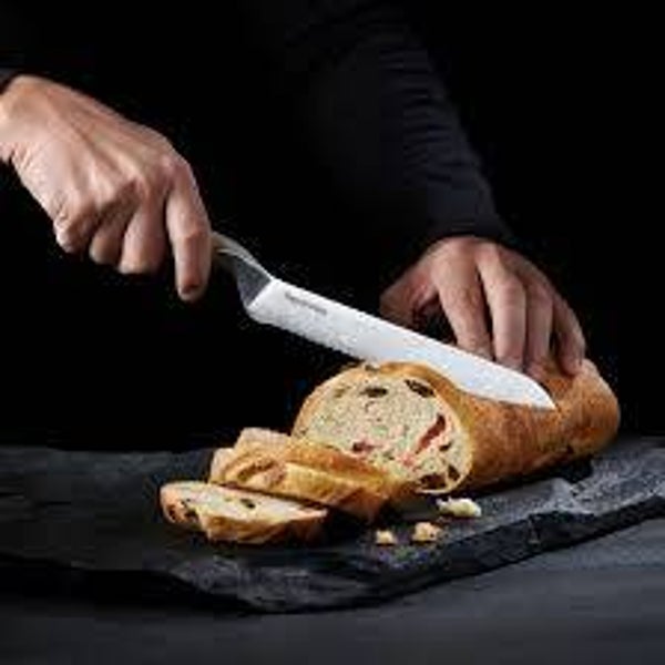 2. Het Tupperware broodmes snijdt gladder en laat minder kruimels achter bij het snijden van brood met een harde korst. Het gebogen ontwerp van de handgreep beschermt je vingers tegen het stoten tegen de snijplank tijdens het snijden, zodat je het lemmet volledig kunt benutten. Gebruik het broodmes om met gemak brood, gebak, cake en broodjes te snijden; het mes is ook geweldig voor het verwijderen van de schil van een ananas of het snijden van grote vruchten zoals watermeloenen en meloenen.