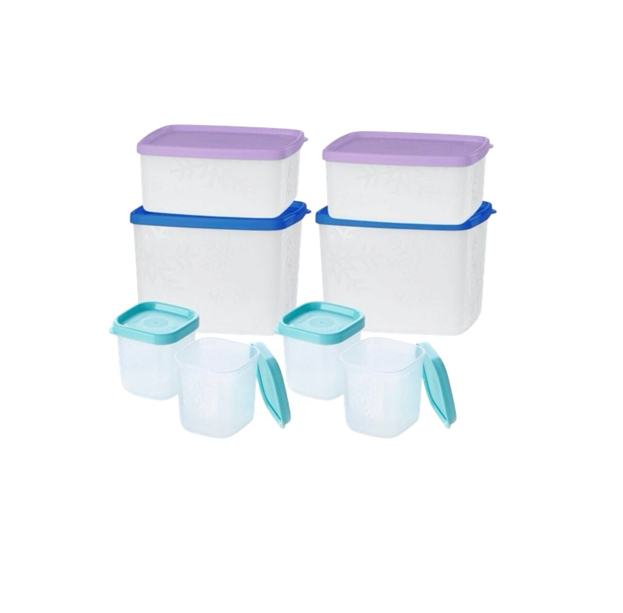 De Diepvries Set bestaat uit 2 x 800ml met donkerblauw deksel, 2 x 400ml met paars deksel en 4 x 80ml met lichtblauw deksel. In de vriezer kunnen ze modulair worden gestapeld om ruimte te besparen en kunnen ze nog meer ruimtebesparend worden geplaatst wanneer ze niet in gebruik zijn. Flexibel materiaal en een conische containervorm zorgen voor de beste vriesresultaten en eenvoudige hantering. Bovendien minimaliseert de Color Control binnenoppervlakafdichting verkleuring.