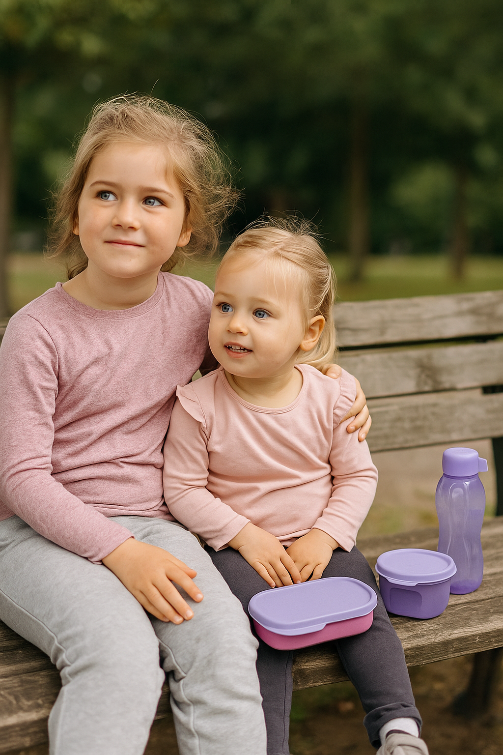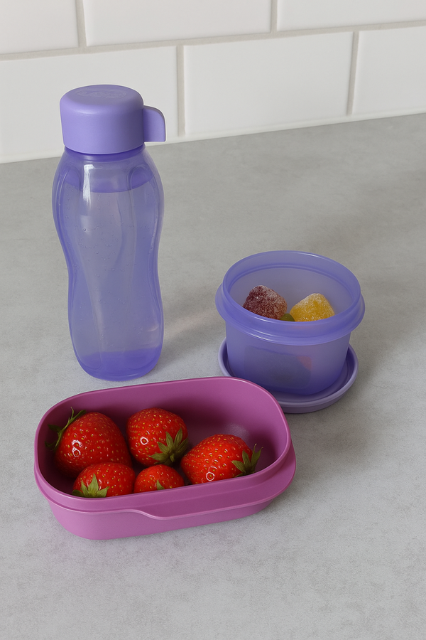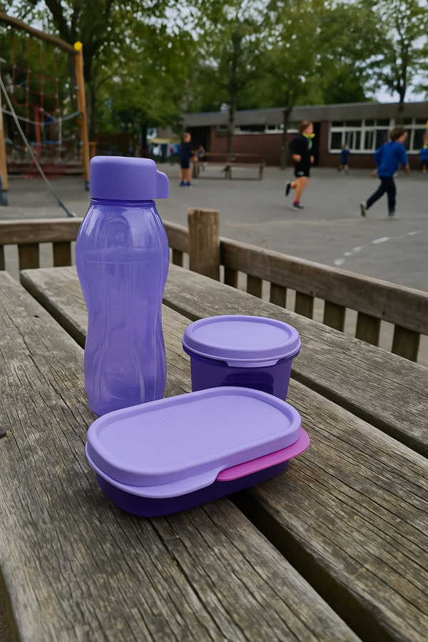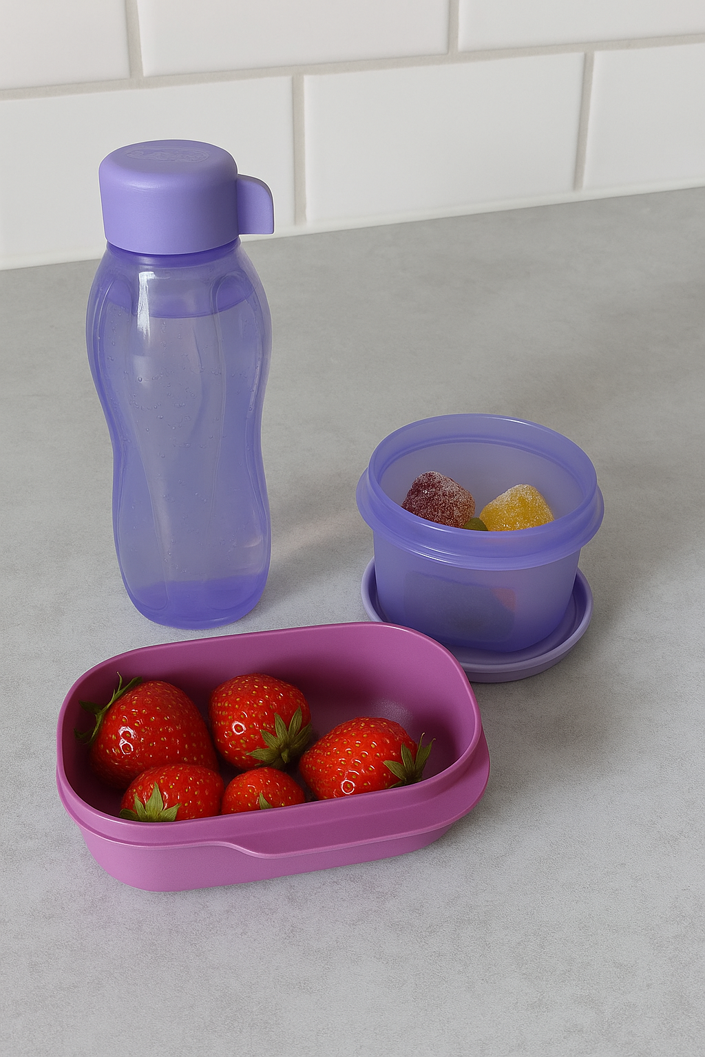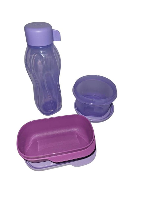 3 delige lunchset paars: ecofles 310ml draaidop, ruimtespaarder rond 200ml en ovaal 120ml
