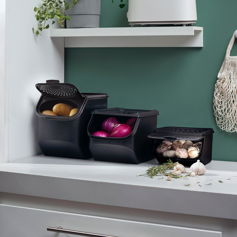 Het Knoflooksmart kan worden gestapeld en gecombineerd met de uien- en aardappelsmart en past qua kleur perfect in het assortiment. Dankzij de afgeschuinde openingen is er altijd voldoende ruimte om de klep comfortabel te openen en te sluiten, zelfs als er een andere container boven wordt geplaatst. Een echt schatje dat in elke keuken een plekje zou moeten vinden.