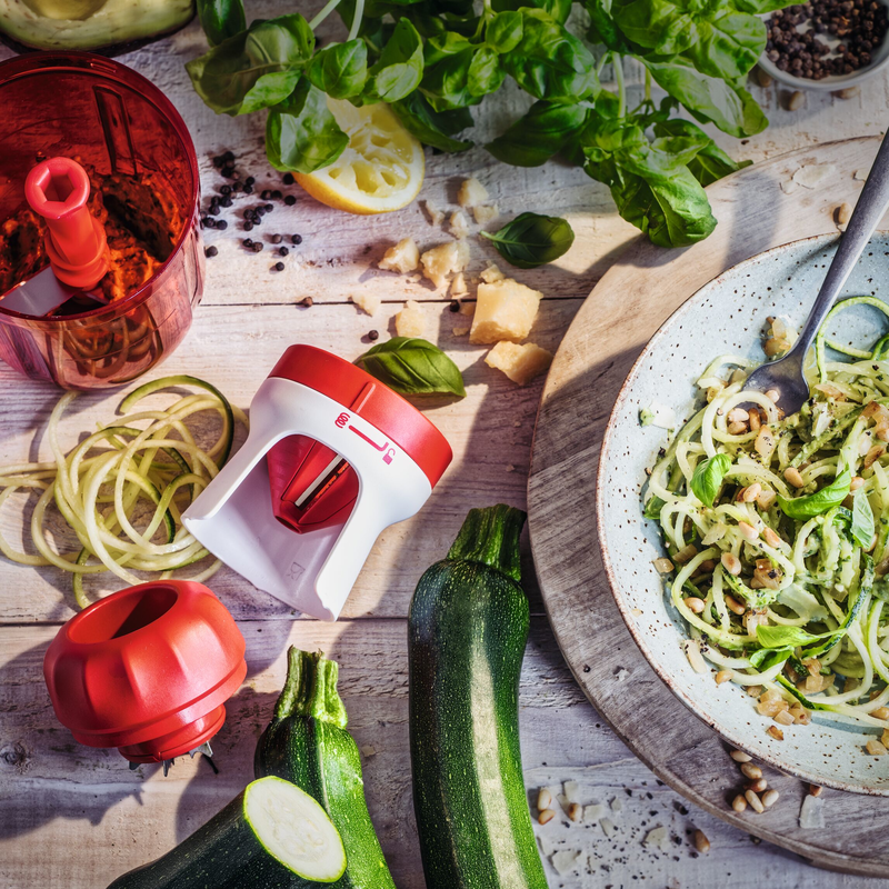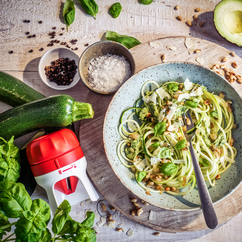 Of het nu als onderdeel van een koolhydraatarm dieet is of gewoon voor meer variatie op het bord: de trendy groentenoedels kunnen op vele manieren worden bereid: kleurrijke raw food salades, gestoomd in de Micro Urban Family met heerlijke pesto, als uitzonderlijk gevormde toppings voor quiches en stevige cakes of gewoon gebakken in de MicroPro Grill of in de pan - wees creatief en vind je favoriete recept.