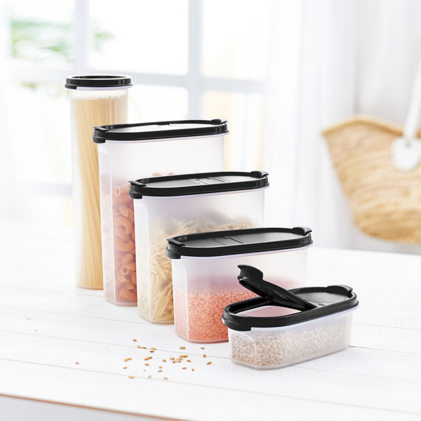 – hebben dezelfde lengte en breedte,ze verschillen alleen in hoogte, – vullen elkaar in hoogte zo aan dat ze op dezelfde hoogte worden gestapeld (modulair), – hebben een transparante opening, d.w.z. de inhoud en de resterende hoeveelheid zijn in één oogopslag herkenbaar. - De ovaal 0,5 l is perfect voor: – zout (500 g) – noten, gemalen (200 g) – amandelen, heel (200 g) – saubindmiddel (250 gr) – chocoladevlokken (100g) – instant bouillon (voor 16 l) – jus (voor ongeveer 3 l) – rozijnen (250 g) – soepnoedels (250 g)