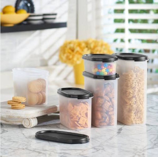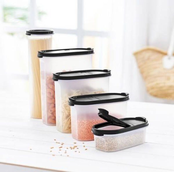 – hebben dezelfde lengte en breedte, ze verschillen alleen in hoogte, – vullen elkaar in hoogte zo aan dat ze op dezelfde hoogte worden gestapeld (modulair), – hebben een transparante opening, d.w.z. de inhoud en de resterende hoeveelheid zijn in één oogopslag herkenbaar. - ovaal 2,3 L