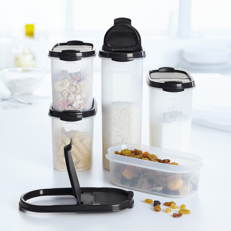In deze set zijn er de populaire Ruimtespaarders in de maten 500 ml, 1,7 l, 2,3 l en 2x 1,1 l. Het is dus de perfecte starterset voor alle huishoudelijke nieuwkomers, of degenen die orde in hun voorraadkast willen brengen - of niet genoeg van orde willen krijgen. Alle droge benodigdheden kunnen ongediertevrij worden opgeborgen, het modulaire systeem maakt een goed overzicht van welke voorraden nog beschikbaar zijn, vooral als dejuiste compacte labels worden gebruikt. En dankzij de transparante containers kun je altijd zien hoeveel content er nog in zit.